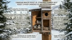 Our winters aren’t Vermont winters. When Environment Canada forecasts windchills reaching -50°C in the Prairies, or Maritime ice storms coat every surface, or Vancouver Island experiences those rare deep freezes that catch everything off-guard—standard American birdhouse designs don’t cut it.